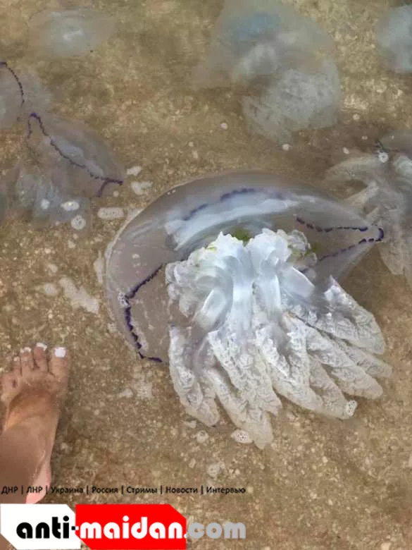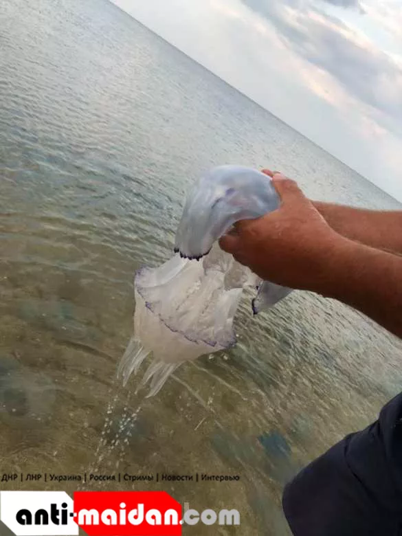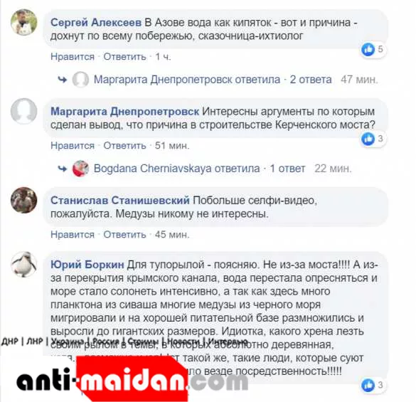 «Для тупорылой поясняю: не из-за моста! А из-за перекрытия Крымского канала: вода перестала опресняться, море стало солонеть,… медузы из Чёрного моря мигрировали, на хорошей питательной базе размножились и выросли до гигантских размеров.