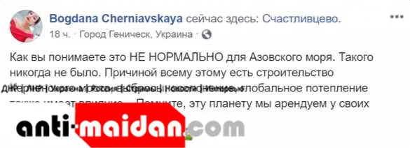 «Это ненормально для Азовского моря. Такого никогда не было. Причиной всему этому есть строительство Керченского моста, выбросы, осолонение, глобальное потепление также имеет влияние», — переживает юрист широкого профиля.