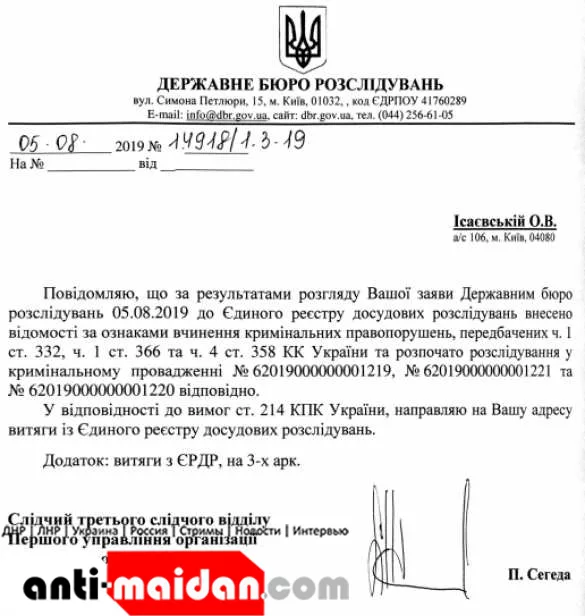 Стоит отметить, что юрист Андрей Портнов, бывший заместитель главы Администрации Президента Виктора Януковича, на своей странице в соцсети опубликовал сообщение от ГБР, в котором говорилось, что по его заявлению сведения о возможном совершении уголовного преступления внесены в Единый реестр досудебных расследований.
