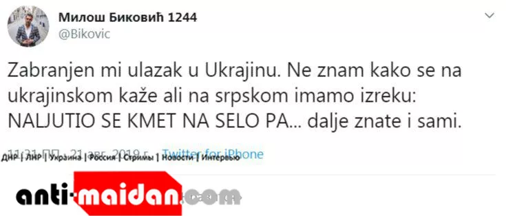 «Мне запрещён въезд на Украину… Я не знаю, как это будет по-украински, но у нас в Сербии есть поговорка „Разозлился старейшина на село…“, дальше и сами знаете», — написал Милош в соцсети.
