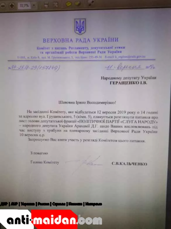 Депутат поделилась фотографией письма Комитета, в котором говорится, что 12 сентября 2019 года в 14.00 планируется рассмотреть вопрос письма главы депутатской фракции политической фракции «Слуга народа» Давида Арахамии относительно ее высказываний во время выступления.
