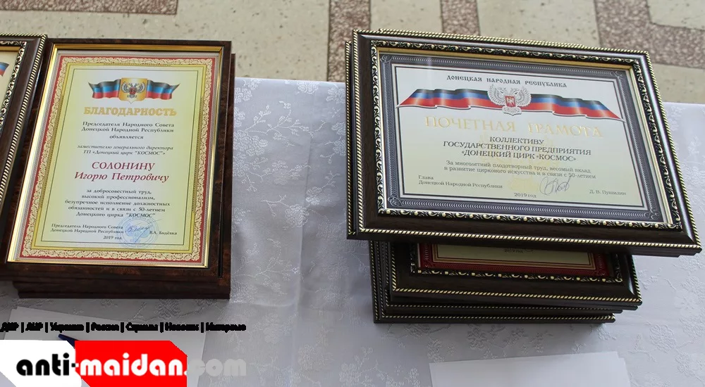 Кроме того, работники цирка «Космос» были награждены благодарностями профильного министерства, профсоюзными премиями, а также юбилейными медалями Донецкого цирка и почетными знаками «Признание».