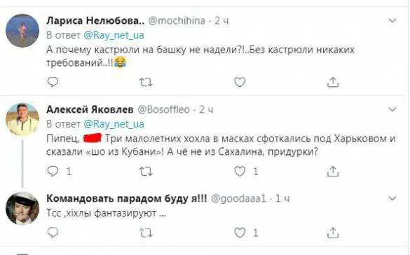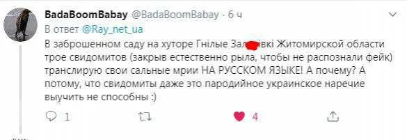 «В заброшенном саду на хуторе Гнiлые Зал***iвкi Житомирской области трое свидомитов (закрыв естественно рыла, чтобы не распознали фейк), транслирую свои сальные мрии НА РУССКОМ ЯЗЫКЕ! А почему? А потому, что свидомиты даже это пародийное украинское наречие выучить не способны», — иронизируют пользователи социальных сетей.
