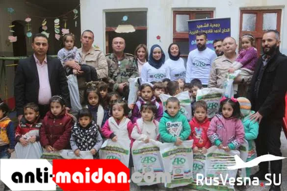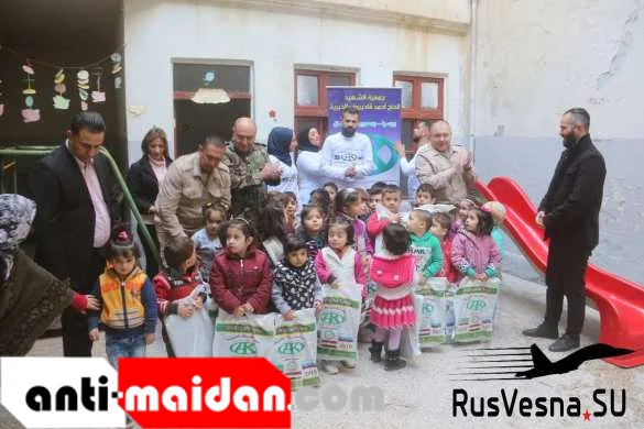 Офицеры российского Центра по примирению враждующих сторон вместе с представителями Общественного фонда имени Героя России Ахмата Кадырова посетили воспитанников детского сада при партии Баас в районе Хаий-Эль-Каласса города Алеппо.