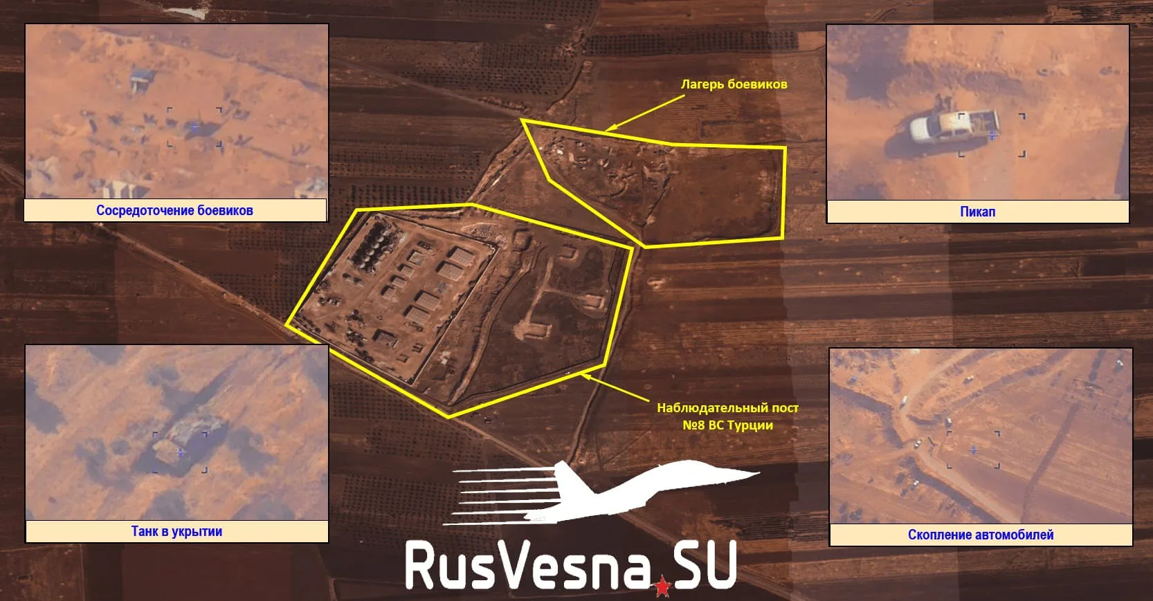 На фото, появившихся в распоряжении «Русской Весны», видно, что вокруг наблюдательного поста Турции № 8 около города Сурман в большом количестве присутствует военная техника СНА, в том числе танки. Боевики устроили вблизи поста целый лагерь.