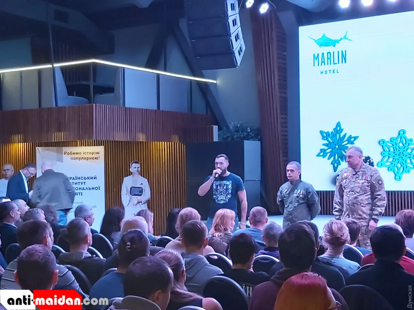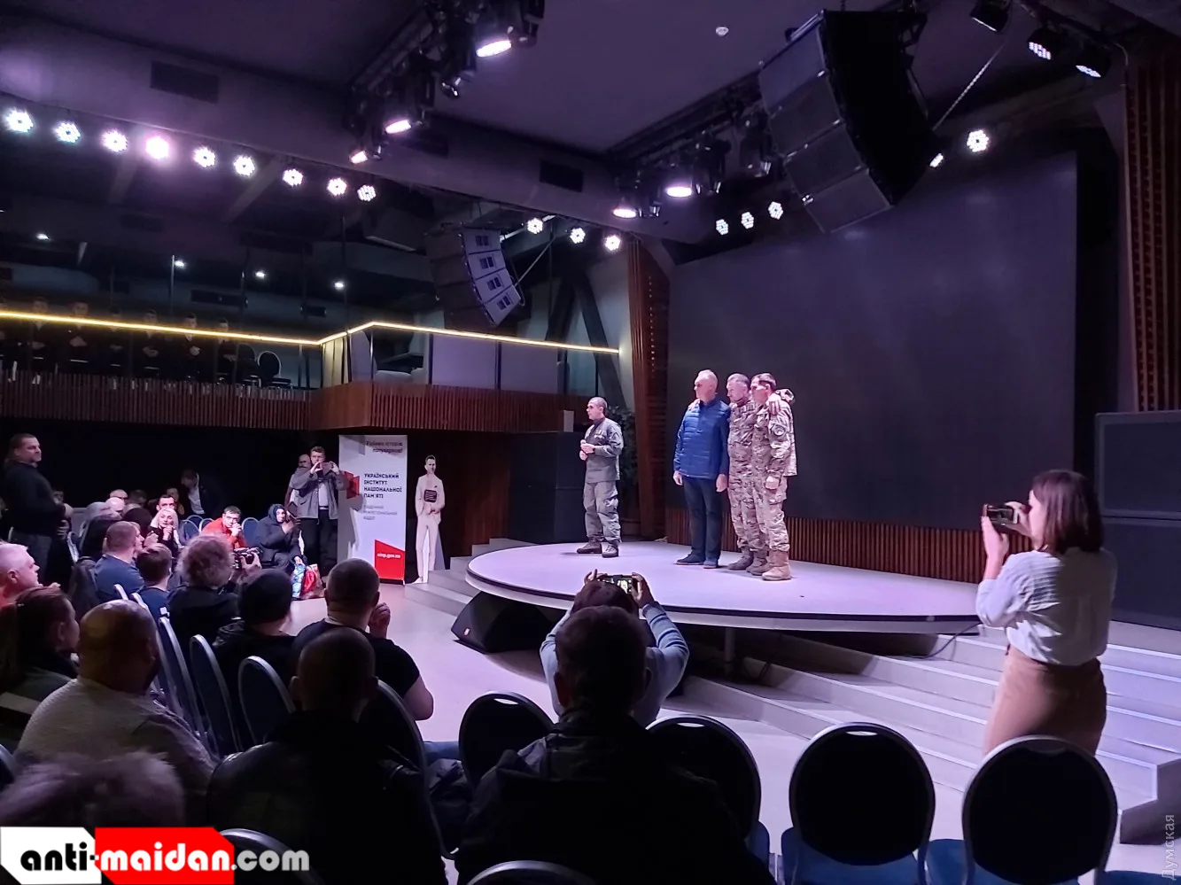 Как сообщают СМИ, на показ в Одессе пришли военные моряки, курсанты, «ветераны АТО» и пособники карателей – так называемые волонтёры. Просмотр фильма окончился аплодисментами стоя (отчего-то не на коленях, как принято у «свидомых» граждан) и выступлением «героiв» позорного отступления. Они рассказали съёмках и о самой войне.