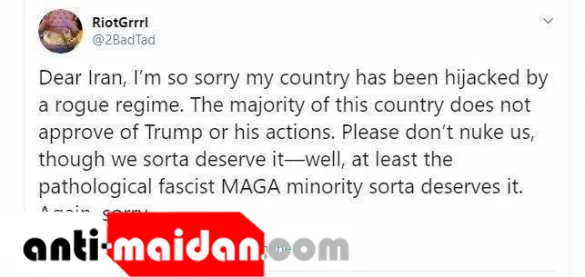 «Дорогой Иран, мне очень жаль, что неукротимый режим похитил мою страну. Большая часть страны не одобряет Трампа или его действий. Пожалуйста, не атакуйте нас ядерным оружием, хотя мы этого заслуживаем — по крайней мере, патологическое фашистское меньшинство, которое поддерживает Трампа, заслужило это. Простите».