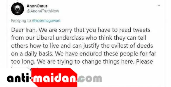«Дорогой Иран, нам жаль читать твиты либералов низкого уровня, которые думают, что они могут указывать другим, как жить, и могут ежедневно оправдывать самые жестокие действия. Мы терпим их долгое время. Мы пытаемся все изменить здесь. Пожалуйста, будьте терпеливы»;