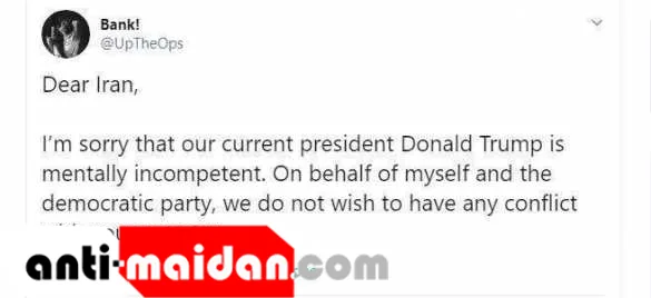 «Дорогой Иран, мне жаль, что наш нынешний президент Трамп психически некомпетентен. Мы и Демократическая партия не хотим конфликта с вашей страной»;
