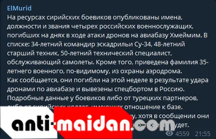 Согласно переводу, который опубликовал у себя русскоязычный канал боевиков «Инспайр», боевики якобы провели атаку с помощью беспилотника на авиабазу «Хмеймим». По данным боевиков, погибли четверо военных, и джихадисты привели даже их имена.