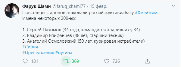 К чему весь этот список «духовно богатых» личностей? А к тому, что в ночь на 15 февраля сирийские Telegram-каналы, которые ведут активисты, симпатизирующие боевикам, стали распространять очередную фейковую новость о гибели российских военнослужащих.