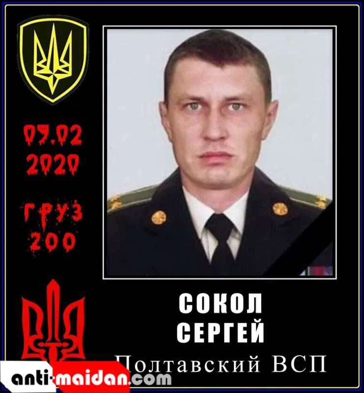 09.02.2020 — Сокол Сергей Юрьевич, 1984 г.р., подполковник, начальник отделения оперативных дежурных Полтавского зонального отдела ВСП. Свою расплату за жизни невинно убиенных мирных жителей Донбасса получил в результате стремительно резвившейся болезни, которая и привела «хероя» к смерти. На родине «хероя и защитника Незалежной» в г. Полтаве Полтавской области остались жена и сын.