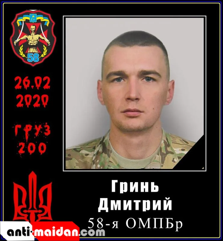 26.02.2020 — Гринь Дмитрий Владимирович, 1992 г.р., старший солдат, старший водитель мотопехотного отделения 13 ОМПБ 58 ОМПБр. С 2014 года добровольно отправился в зону «ООС», где за деньги истреблял мирное население Донбасса.