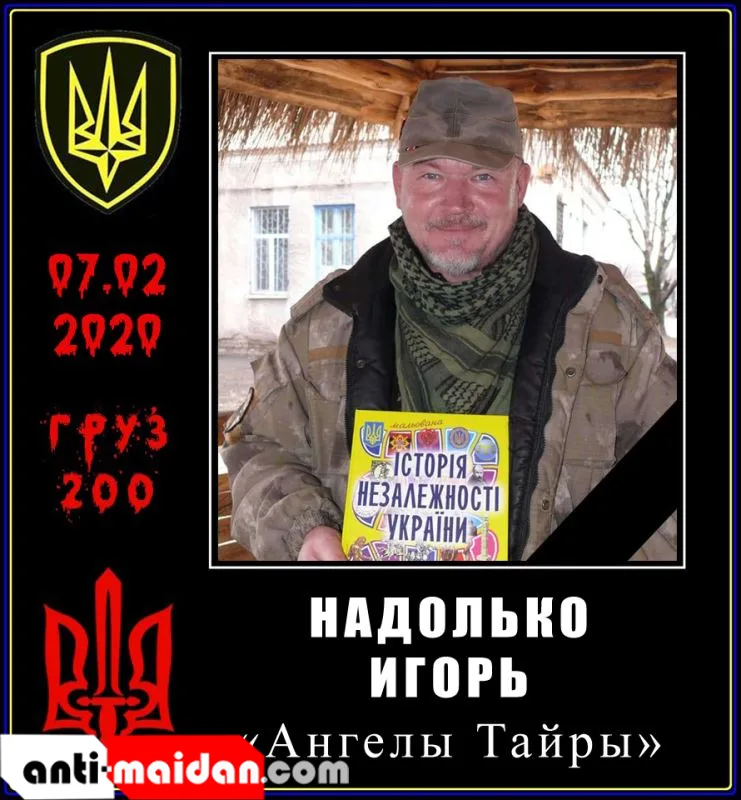 07.02.2020 — Надолько Игорь Михайлович, 1968 г.р., парамедик волонтерского медицинского подразделения «Ангелы Тайры», инструктор по тактической медицине. С самого начала войны добровольно отправился в зону «АТО», где за деньги истреблял мирное население Донбасса.