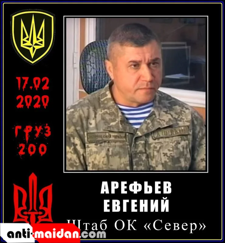 17.02.2020 — Арефьев Евгений Витальевич, 1972 г.р., майор, военнослужащий отдела военной разведки управления разведки штаба ОК «Север». Служил по контракту во Французском иностранном легионе, но с началом войны в 2014 добровольцем в составе 79 ОДШБр, где был командиром разведывательного взвода в составе 1-го батальона, отправился на Донбасс — за деньги уничтожать мирное население.