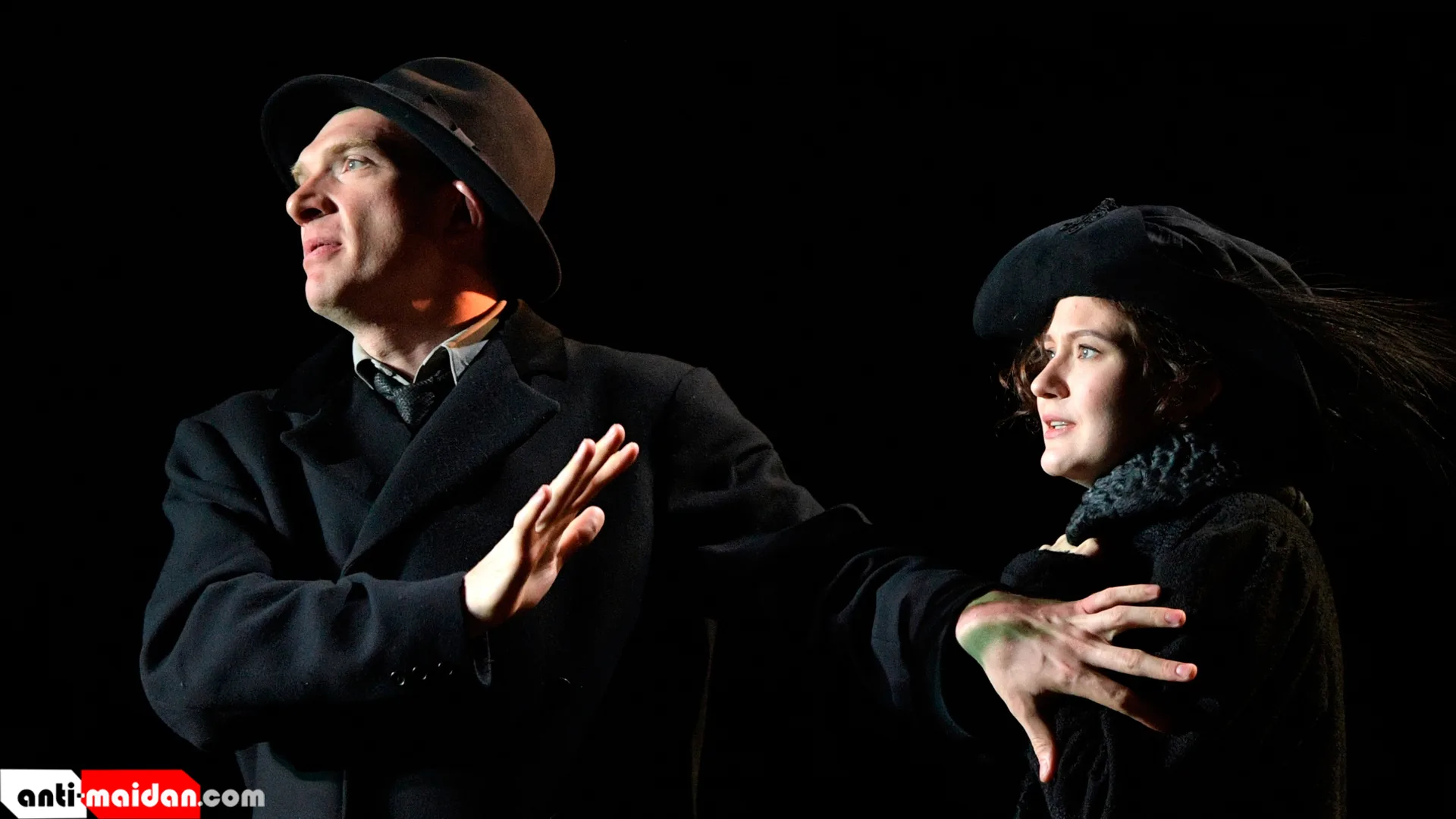 - Андрей Бурковский в роли Сергея Павловича Голубкова и Яна Гладких в роли Серафимы Владимировны Корзухиной в сцене из спектакля «Бег» по пьесе Михаила Булгакова в Московском художественном театре (МХТ ) имени А. П. Чехова