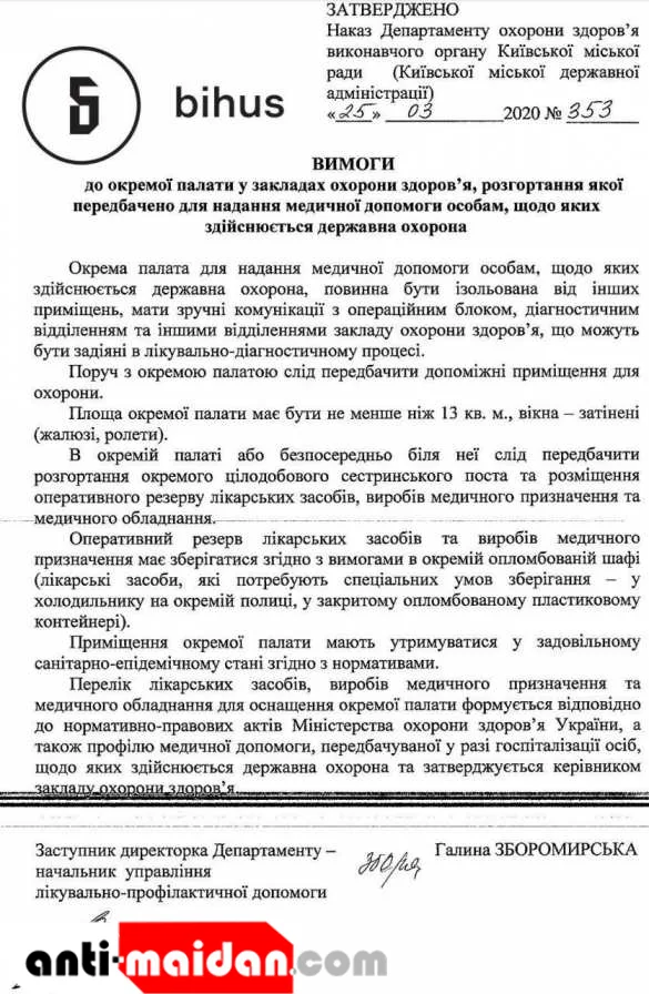 В Киевской городской госадминистрации распорядились о подготовке особых палат в больницах для «особых пациентов». Приказ отсутствует на официальном сайте мэрии, но его копию публикуют украинские СМИ.