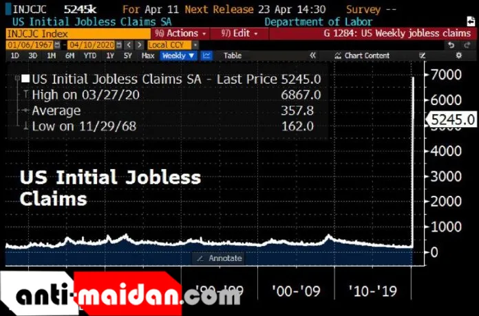 Соединённые Штаты Америки продолжают пребывать в состоянии экономического кризиса, масштабы которого уже побили исторические рекорды прошлого. Финансовые аналитики WSJ в четверг, 16 апреля, сообщает, что с 4 по 11-е апреля в стране было подано дополнительно 5.2 млн заявок на получение пособия по безработице.