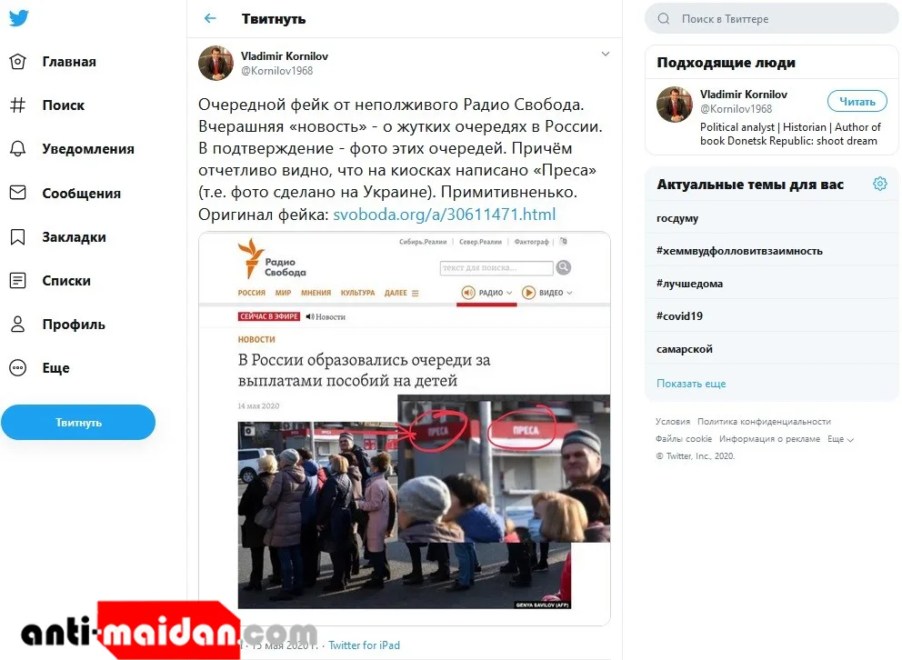 Политэксперт Владимир Корнилов первым обратил внимание на вброс либерального американского издания. Фейковую фотографию, где якобы выстроилась огромная очередь у Пенсионного фонда за пособиями, выдала вывеска на украинском языке «Преса» на заднем плане.