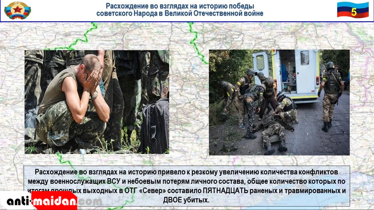 Расхождение во взглядах на историю привело к резкому увеличению количества конфликтов между военнослужащихми ВСУ и небоевым потерям личного состава, общее количество которых по итогам прошлых выходных в ОТГ «Север» составило пятнадцать раненых и травмированных и двое убитых.
