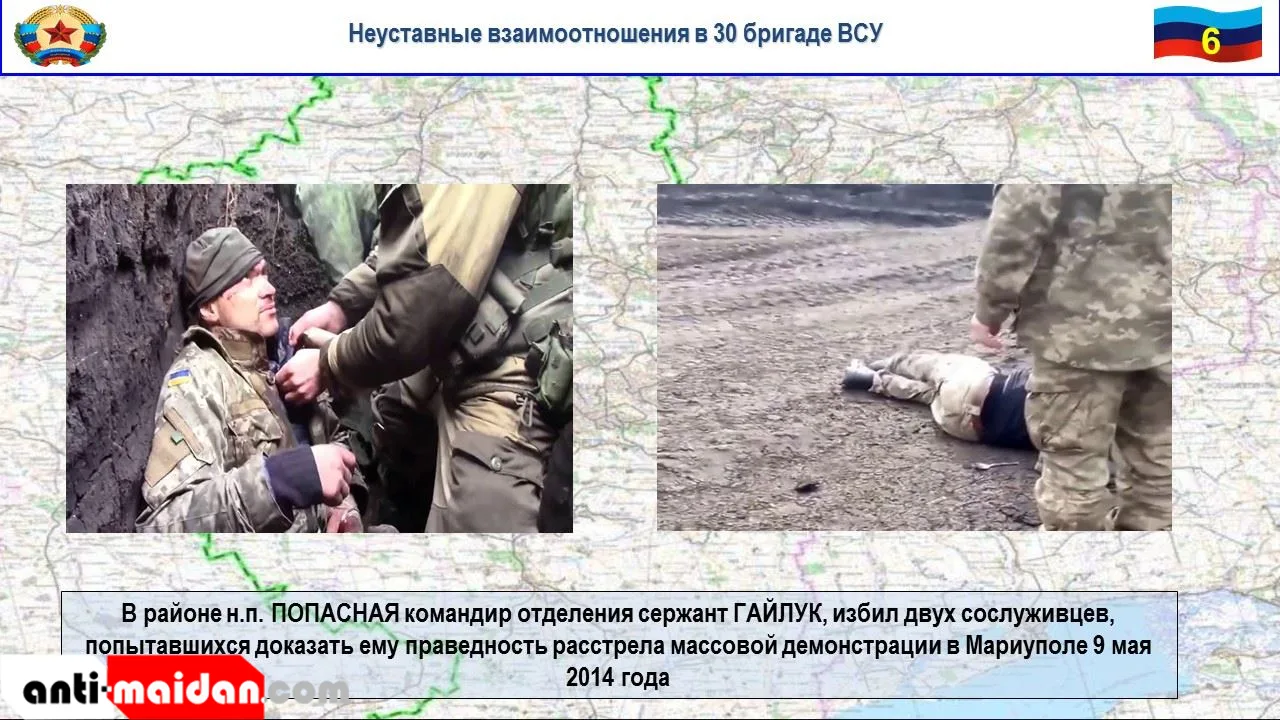 Еще один случай неуставных взаимоотношений произошел 9 мая во 2 механизированном батальоне 30 бригады в районе н.п. Попасная, где уроженец Мариуполя, командир отделения сержант Гайлук, избил двух сослуживцев, попытавшихся доказать ему праведность расстрела массовой демонстрации в Мариуполе 9 мая 2014 года, где украинскими националистами было убито 13 и ранено 39 мирных демонстрантов.