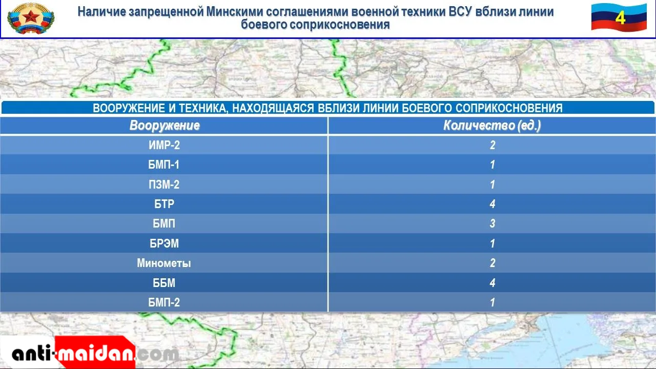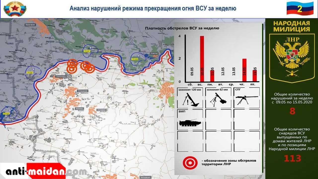 На славяносербском направлении боевики 93 отдельной механизированной бригады ВСУ по приказу военного преступника Брыжинского обстреляли из минометов калибра 120 и 82-мм, станкового противотанкового гранатомета и вооружения БМП-2 н.п. Желобок, Фрунзе, Голубовское, Донецкий и Березовское.