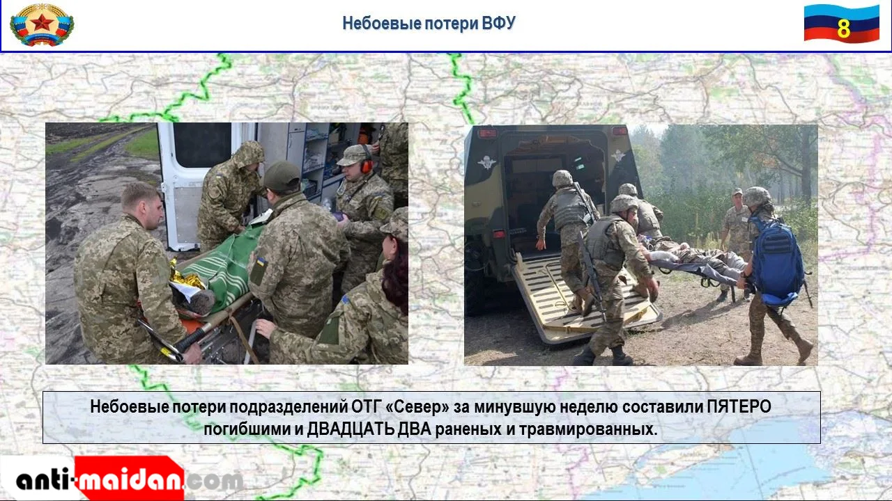 Таким образом, небоевые потери подразделений ОТГ «Север» за минувшую неделю составили пятеро погибшими и двадцать два раненых и травмированных.