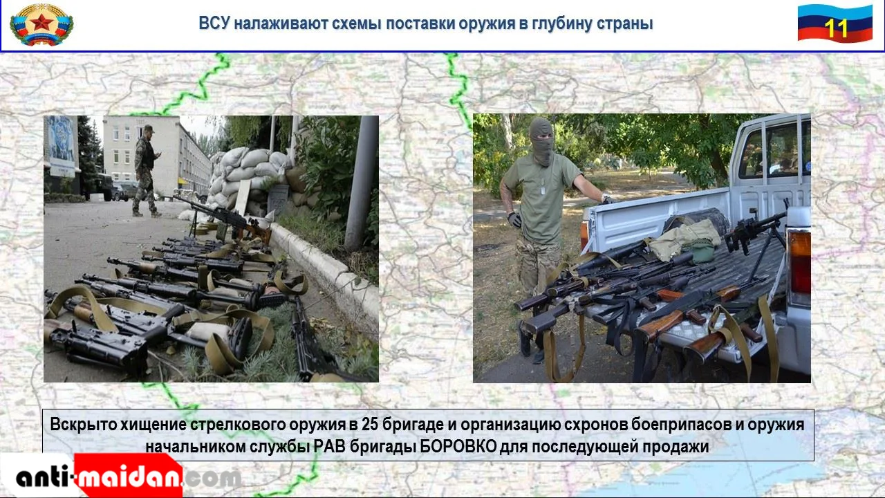Комиссией службы РАВ ОТГ «Север», проводящей проверку в период с 10 по 13 мая вопросов хранения и учета оружия и боеприпасов в подразделениях 25 и 93 бригад ВСУ, вскрыто хищение стрелкового оружия в 25 бригаде, а так же организация схронов боеприпасов и оружия начальником службы РАВ бригады Боровко для последующей продажи.
