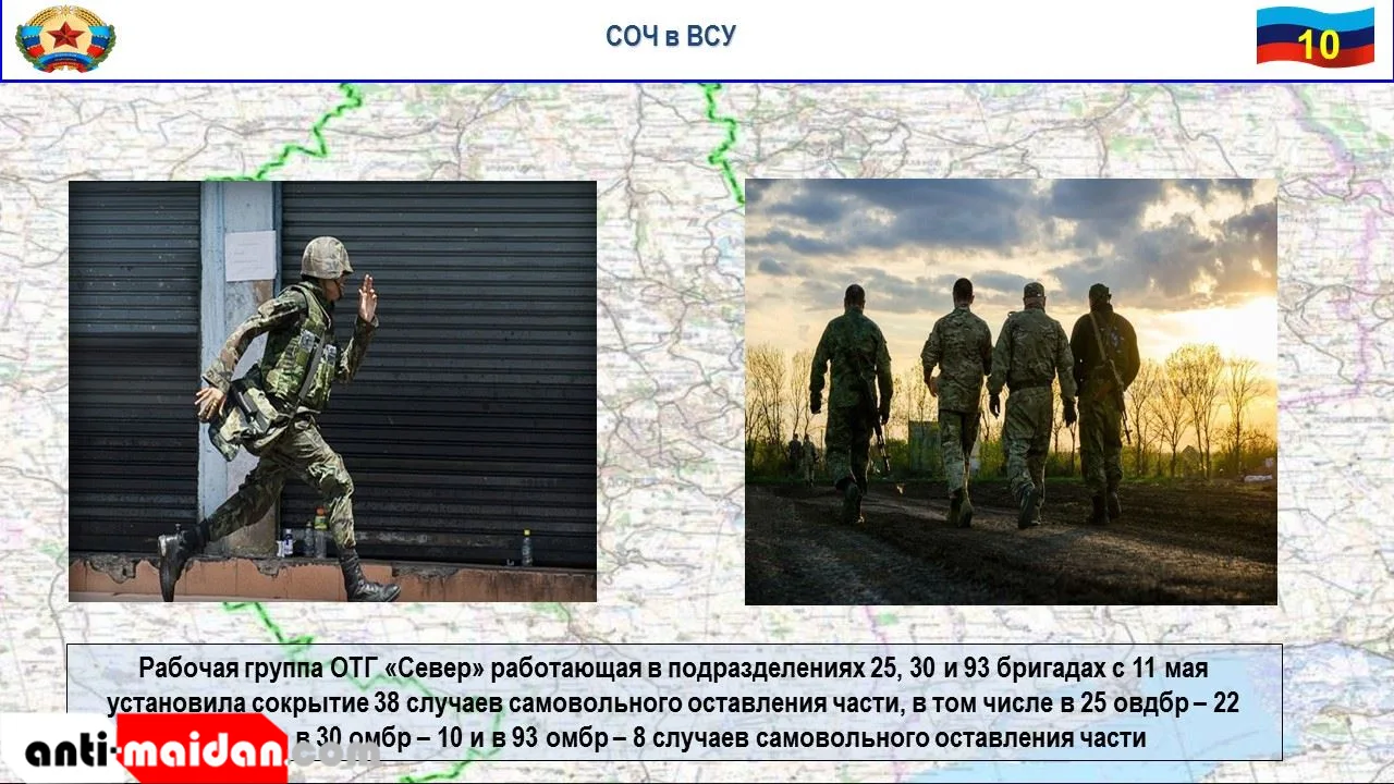 Рабочая группа ОТГ «Север» под руководством помощника командующего ОС по стратегическим коммуникациям полковника Гуменного, работающая в подразделениях 25, 30 и 93 бригадах с 11 мая с целью изучения эпидемиологической обстановки и реального положения дел в подразделениях, установила сокрытие тридцати восьми случаев самовольного оставления части, в том числе в 25 овдбр — двадцать два случая, в 30 омбр — десять и в 93 омбр — шесть случаев самовольного оставления части.