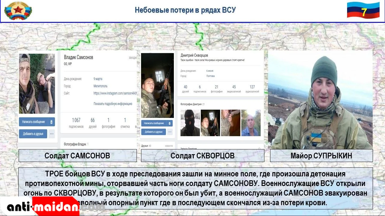 Оказывая сопротивление он нанес тяжкие телесные повреждения двум нападавшим и с оружием скрылся в прилегающем лесном массиве. В ходе его преследования находящаяся в состоянии алкогольного опьянения группа из трех боевиков ВСУ незаметно для себя зашла на минное поле, где произошла детонация противопехотной мины, оторвавшей часть ноги солдату Самсонову.