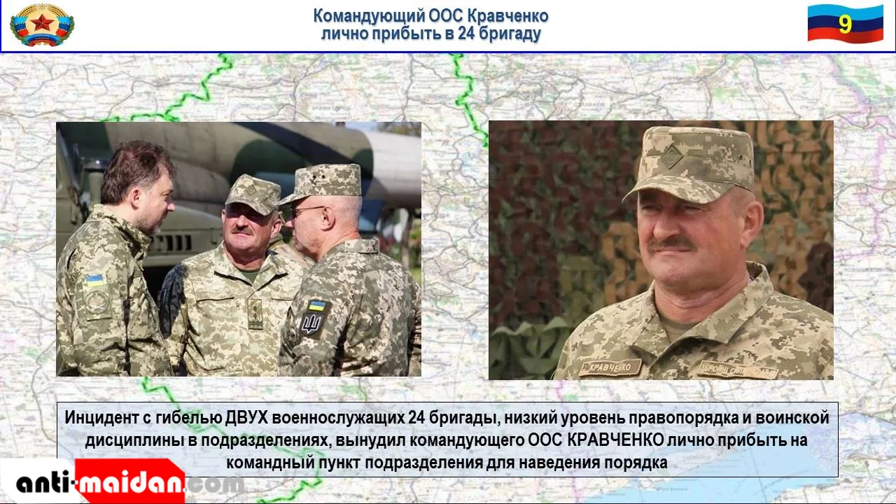 Инцидент с гибелью двух военнослужащих 24 бригады сразу по прибытии в зону «ООС», низкий уровень правопорядка и воинской дисциплины в подразделениях вынудили командующего «ООС» Кравченко лично прибыть на командный пункт подразделения в н.п. Бахмут для наведения порядка.