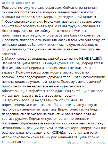 «Учитесь просчитывать ситуацию, чтобы избегать близких контактов. Запомните: если вы не будете соблюдать социальную дистанцию, никакие маски вам не помогут и не защитят», — написал Мясников в Telegram.