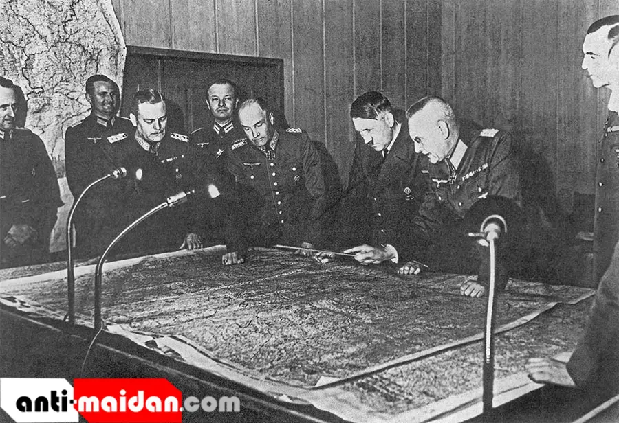 • Генерал-фельдмаршал В. Кейтель, генерал-полковник В. фон Браухич, А. Гитлер, генерал-полковник Ф.Гальдер (слева направо на первом плане) около стола с картой во время совещания генерального штаба. В 1940 году Адольф Гитлер подписал основную директиву №21 под кодовым названием «Барбаросса»