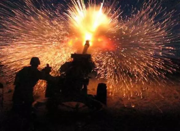 Тяжёлая артиллерия 1-й Славянской бригады Народной милиции ДНР поддерживает огнём наступление пехоты.